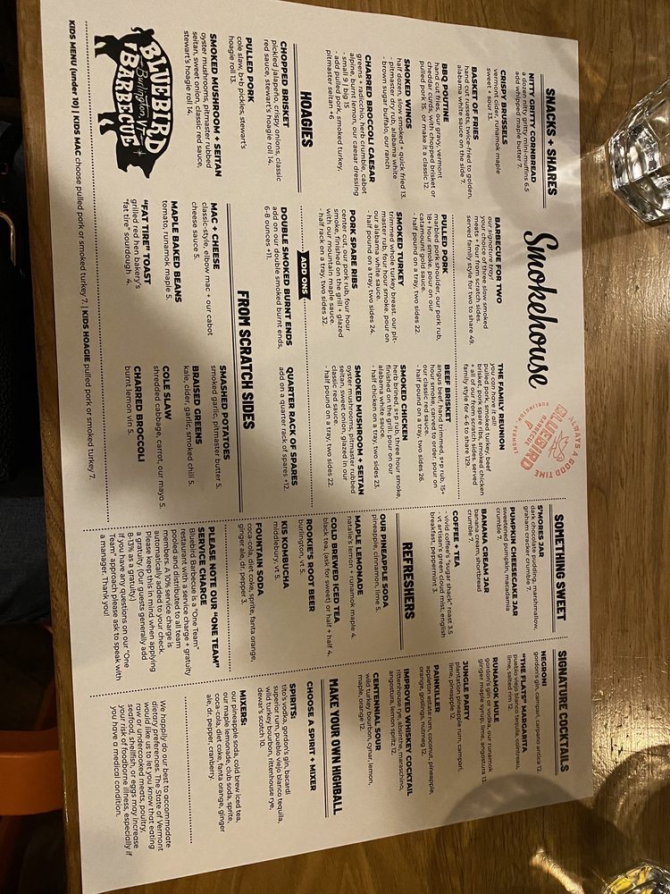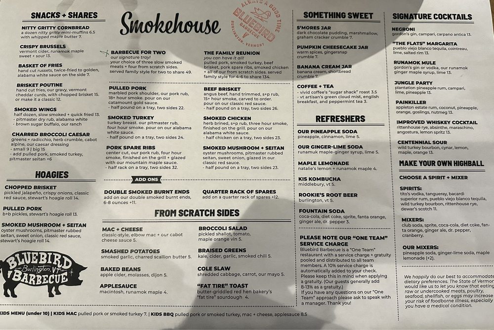 Bluebird Barbecue, located in Burlington, VT, offers a unique dining experience with a focus on barbecue, chicken wings, and a variety of beer options. The restaurant provides a casual yet classy atmosphere with outdoor seating overlooking the Winooski River. The menu includes vegan options, limited vegetarian choices, and a range of delicious dishes such as brisket hoagies, seitan, and the signature brisket poutine. Customers praise the authentic flavors, generous portions, and creative drink offerings like the Ginger-Lime Soda. The Nitty Gritty Cornbread with Maple Butter and the assortment of meats and sides for the Barbecue for 2 are particular standouts. With attentive service, a scenic backdrop, and a vibrant atmosphere, Bluebird Barbecue is a must-try destination for BBQ enthusiasts.
